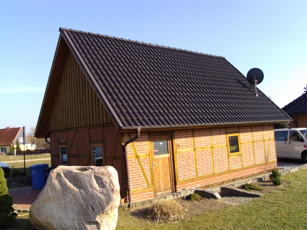 Fachwerkgarage aus Lärchenholz sägerau. Das Fachwerk wurde traditionell mit Holzverbindungen wie Zapfen und Holznagel gefertigt ohne Verbindungsmittel wie Winkel und Schrauben.