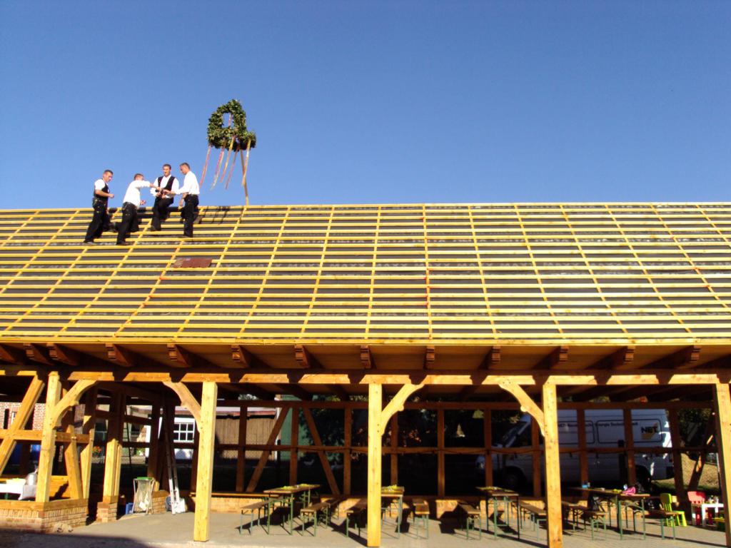 Neubau einer Fachwerkscheune aus Eiche, später mit Reetdachdeckung hergestellt.